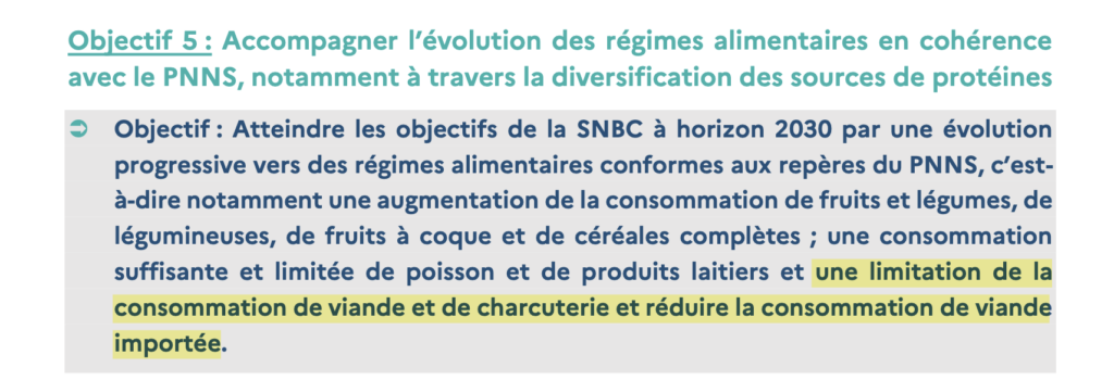 Troisième problème : la SNANC évite de fixer des objectifs chiffrés et contraignants. Cette approche reflète à nouveau la timidité de ses auteurs qui ne semblent pas pouvoir contredire la SNBC ou le PNNS, sans oser rendre ces engagements tangibles. Cela contraste également avec les avis de l’ANSES et du Haut Conseil pour le Climat, qui préconisent une transition nette vers une alimentation plus végétale.